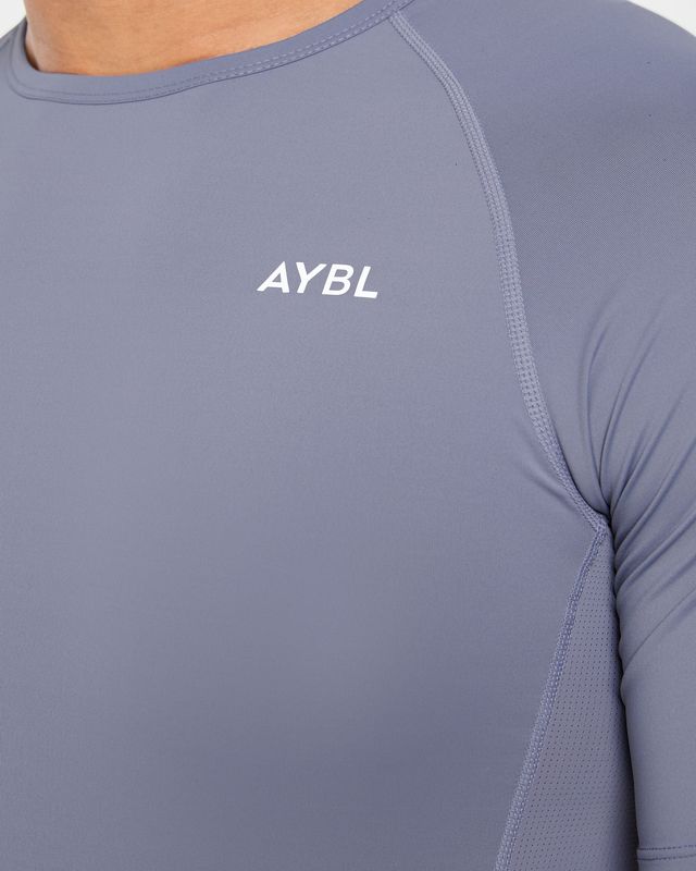 For reference, our fit model stands at 6’1″ (1.86m) and wears a size Large. This demonstrates how the shirt contours to a tall, athletic frame without riding up or bunching. The AYBL logo is subtly placed on the front chest, adding a touch of brand identity without distracting from your performance.